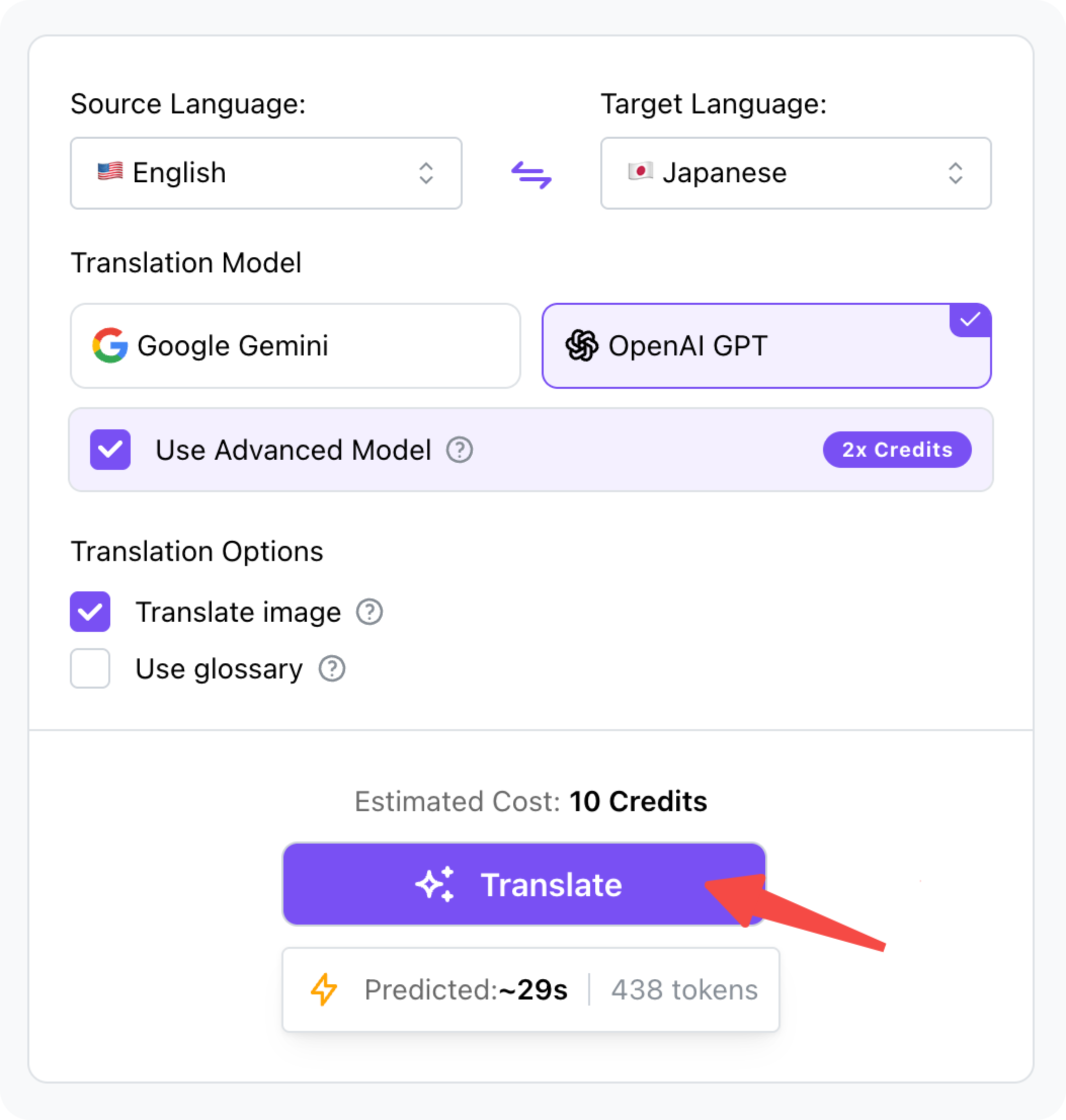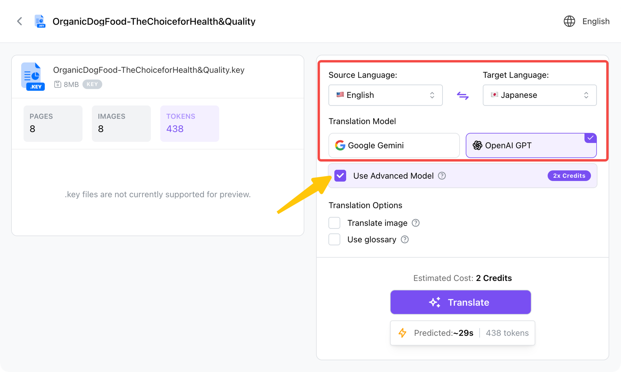 2.Set Parameters: Choose the target language and translation model. For the highest quality results, checking the “Use Advanced Model” option is recommended.