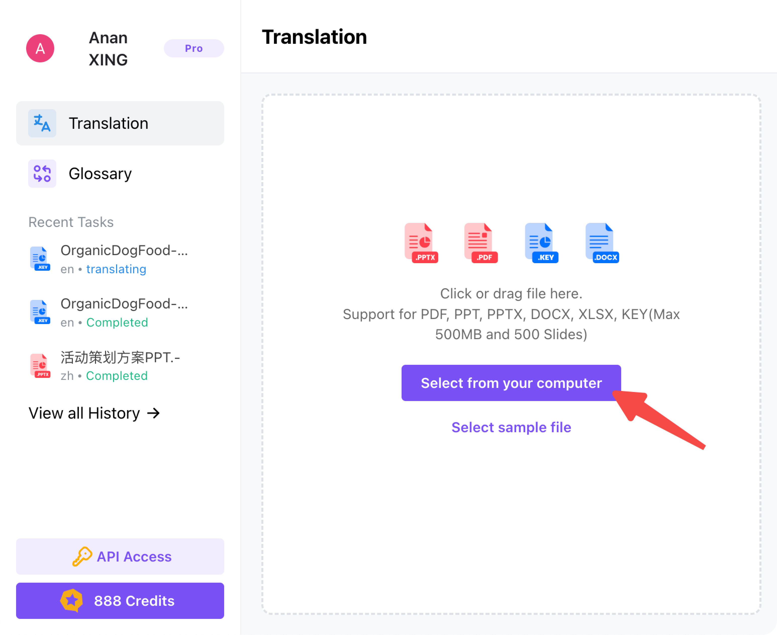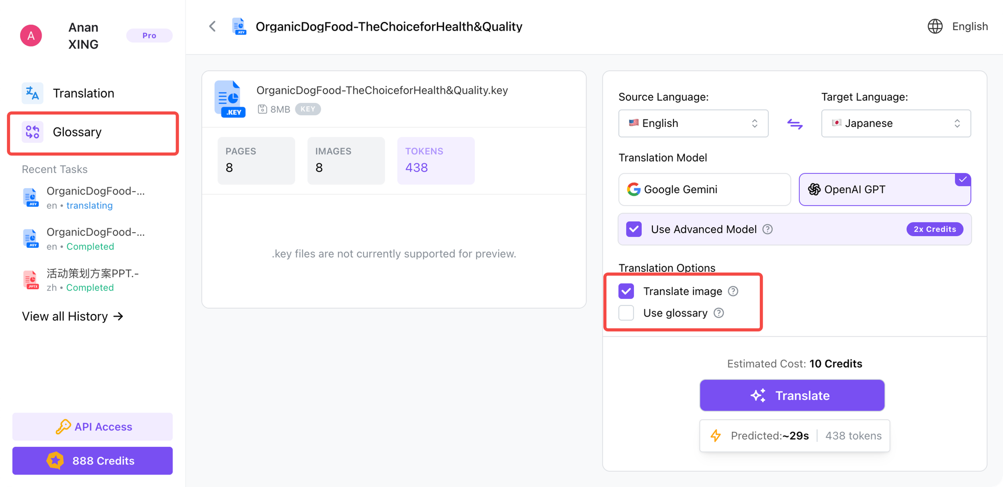 - Glossary Management: To ensure specific terms are translated consistently, check “Use glossary”. Users can pre-load professional terminology in the “Glossary” section on the left sidebar.